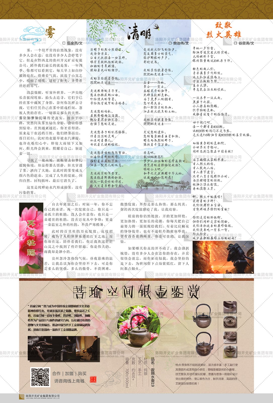 洛陽(yáng)開(kāi)元礦業(yè)集團(tuán)有限公司簡(jiǎn)介洛陽(yáng)開(kāi)元礦業(yè)集團(tuán)有限公司,始成立于2006年,位于洛陽(yáng)市開(kāi)元大道269號(hào)。集團(tuán)旗下共有五余家全資子公司,業(yè)務(wù)涉及有色金屬礦山開(kāi)發(fā)、礦產(chǎn)品購(gòu)銷與進(jìn)出口貿(mào)易、房地產(chǎn)開(kāi)發(fā)、文化藝術(shù)、企業(yè)管理與咨詢、資本投資等多個(gè)領(lǐng)域。民建河南省委委員、民建河南省委企業(yè)委副主任、民建洛陽(yáng)市委委員、企業(yè)委主任、洛陽(yáng)民建企業(yè)家協(xié)會(huì)會(huì)長(zhǎng)許明月是公司創(chuàng)始人,現(xiàn)任洛陽(yáng)開(kāi)元礦業(yè)集團(tuán)有限公司董事長(zhǎng)。在礦業(yè)領(lǐng)域,洛陽(yáng)開(kāi)元礦業(yè)集團(tuán)擁有多家實(shí)力雄厚的子公司:貴州開(kāi)元礦業(yè)有限公司探、采礦權(quán)面積共11.33平方公里;興??h銅鑫礦業(yè)有限公司探礦權(quán)面積8.76平方公里,礦山資源潛力巨大;2021年,開(kāi)元集團(tuán)與盧氏中科礦業(yè)有限公司開(kāi)展戰(zhàn)略合作。盧氏中科礦業(yè)有限公司專注于有色金屬的浮選、加工和銷售,擁有強(qiáng)大的技術(shù)支撐平臺(tái),是集探、采、選、冶、研為一體的中大型綜合礦業(yè)企業(yè)。目前,盧氏中科王家河1000噸選礦廠已成功投產(chǎn),雙河金礦、柳關(guān)欒盧鉛鋅礦相繼順利開(kāi)工,樓房銀礦與圪老灣鉛鋅礦的深部探礦重大突破,標(biāo)志著礦山版圖取得重大進(jìn)展,為開(kāi)元集團(tuán)后續(xù)發(fā)展奠定了堅(jiān)實(shí)基礎(chǔ)。在文化傳媒領(lǐng)域,洛陽(yáng)市明月美術(shù)館通過(guò)豐富多樣的藝術(shù)展覽、學(xué)術(shù)研討和公共教育活動(dòng),努力打造一個(gè)集展覽、交流、教育、研究為一體的綜合性藝術(shù)平臺(tái)。此外,在金融投資領(lǐng)域,開(kāi)元集團(tuán)旗下的北京明峰資本管理有限公司專注于投資具有高增長(zhǎng)潛力的優(yōu)秀企業(yè),特別是高科技、新能源、環(huán)保等新興產(chǎn)業(yè),為客戶提供個(gè)性化的資產(chǎn)配置服務(wù)。在做好企業(yè)經(jīng)營(yíng)的同時(shí),開(kāi)元集團(tuán)始終不忘企業(yè)的社會(huì)責(zé)任和家國(guó)情懷,以突出的愛(ài)心公益事跡,開(kāi)展了一系列公益慈善活動(dòng):“民建林”公益事業(yè)通過(guò)“思源基金”“幫幫公益”線上公益平臺(tái),與眾多愛(ài)心人士籌措資金20余萬(wàn)元;資助541名貧困大學(xué)生共計(jì)270余萬(wàn)元,推進(jìn)“數(shù)字助力——河南AI人才培養(yǎng)”;捐款10萬(wàn)元,馳援京津冀、黑龍江洪水地質(zhì)災(zāi)害……公司于2017年底被洛陽(yáng)市慈善總會(huì)評(píng)為“洛陽(yáng)慈善風(fēng)云榜——十大愛(ài)心集體”。洛陽(yáng)開(kāi)元礦業(yè)集團(tuán)有限公司秉承持續(xù)發(fā)展理念,憑借多年來(lái)良好的企業(yè)信譽(yù)與經(jīng)營(yíng)業(yè)績(jī),與全國(guó)多家企業(yè)建立了良好合作關(guān)系,受到社會(huì)各界的一致好評(píng),多次榮獲“納稅標(biāo)兵”“先進(jìn)企業(yè)”“招商引資模范企業(yè)”等榮譽(yù)稱號(hào)?;赝麃?lái)時(shí)路,開(kāi)元人勠力同心,以“闖”的精神和“創(chuàng)”的勁頭,一路披荊斬棘,踏過(guò)千山萬(wàn)水;展望新未來(lái),開(kāi)元人凝心聚力,不執(zhí)于“舊”,無(wú)畏于“新”,秉承“勇于跨越,追求卓越”的企業(yè)精神,乘著國(guó)家高質(zhì)量發(fā)展新征程的東風(fēng),跨過(guò)高山,越過(guò)大海,向著集團(tuán)多元化、國(guó)際化的目標(biāo),逐夢(mèng)遠(yuǎn)航,跨越前行!